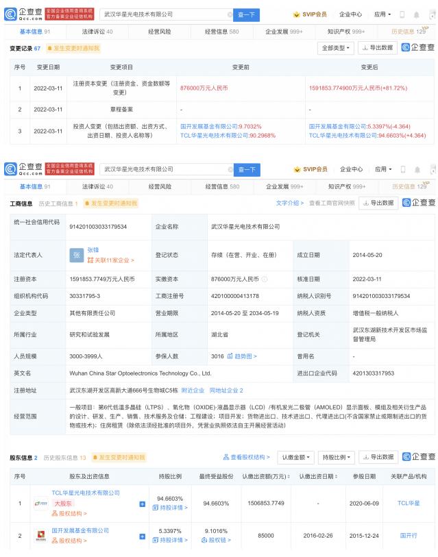 企查查APP显示,3月11日,武汉华星光电技术有限公司发生工商变更,公司注册资本由87.6亿元人民币增加至159.19亿元人民币,增幅81.72%。企查查信息显示,该公司成立于2014年,法定代表人为张锋,经营范围包含:第6代低温多晶硅(LTPS)、氧化物(OXIDE)·液晶显示器(LCD)/有机发光二极管(AMOLED)显示面板、模组及相关衍生产品的设计等,由TCL华星光电技术有限公司、国开发展基金有限公司共同持股。